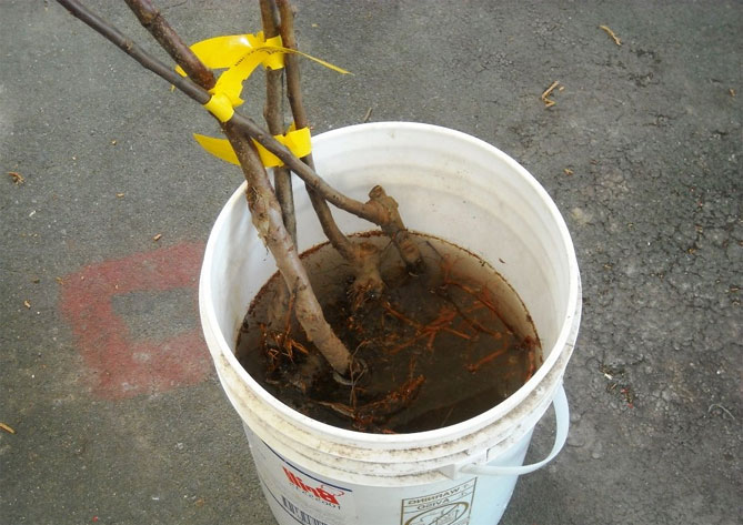 - Накисващи корени. За да отгледате здраво дърво, трябва да накиснете корените във вода преди засаждането. Тази процедура подобрява степента на оцеляване на разсада след засаждането.
