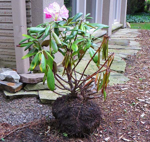 При засаждане на рододендрон се прави яма с дълбочина 70 см. Изсипва се 2/3 от сместа и се прави пързалка в центъра, върху която се поставя разсадът. Когато копаете със земя, трябва да притиснете добре рохката почва. След засаждането можете да оплодите храста с минерален тор. Също така е необходимо да се направи кладенец за поливане около храста.