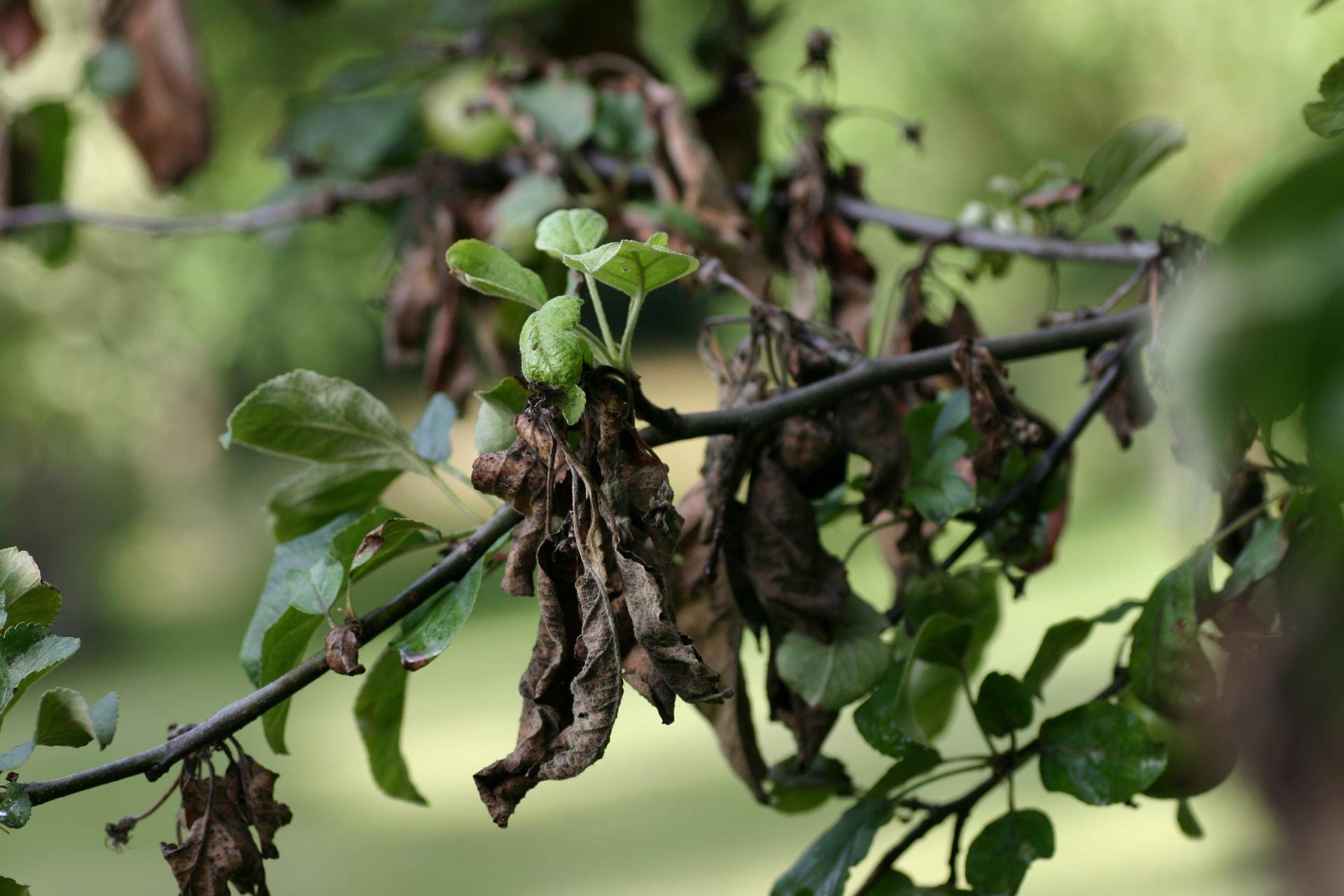 Активността от пожар е най-висока в началото на лятото (от края на юни до юли). Петната се разпространяват бързо в листата. Дърво с тежки лезии изглежда изгорено. Следователно болестта се нарича изгаряне. Лекува се с антибиотик.