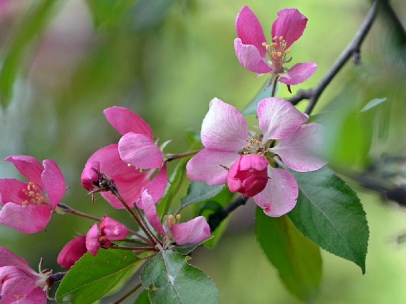 Цъфтежът започва в началото на пролетта, през април. Вниманието се привлича от големите бели и бледорозови цветя на ябълковото дърво с ярко лилави вени и приятен аромат.