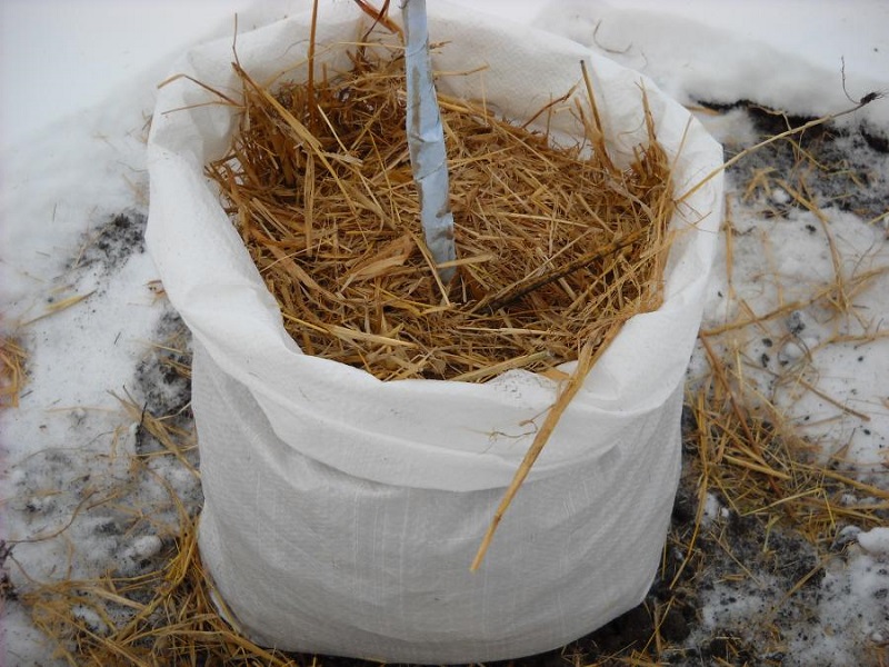 - Увийте дървото с няколко слоя чул, като поставите суха слама между тях, сигурно фиксирайте инсталацията с въже.