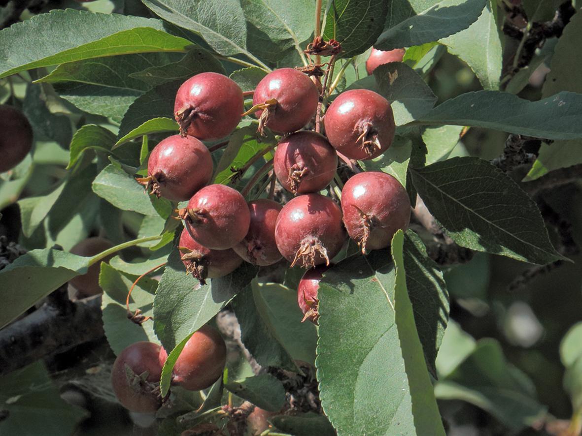 Дървото започва да дава плодове само 10 години след засаждането. Ябълките са малки - само 1,8 мм в диаметър. Те са малки, едва тежат 20 г. Плодовете са розово-лилави с червена плът.