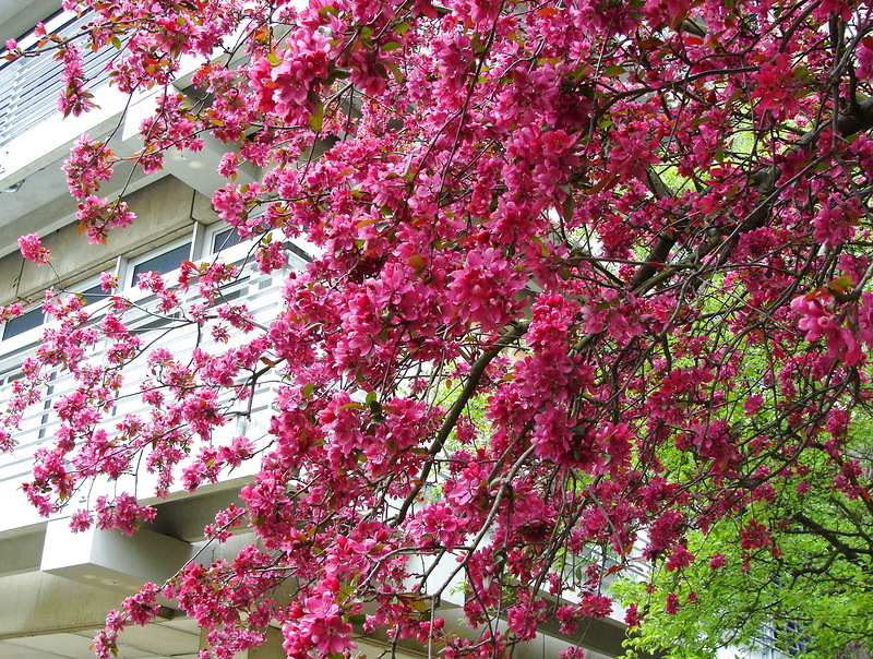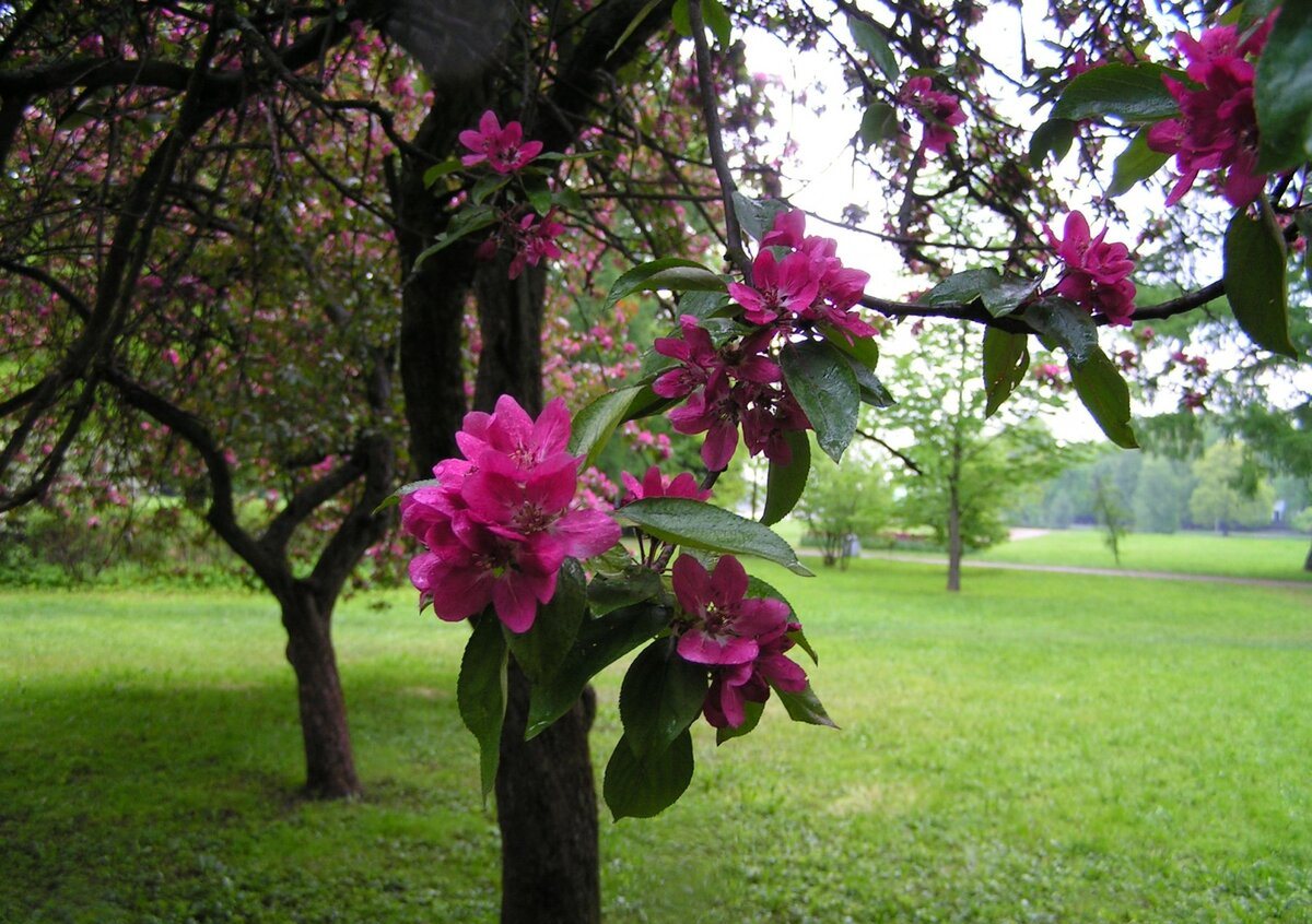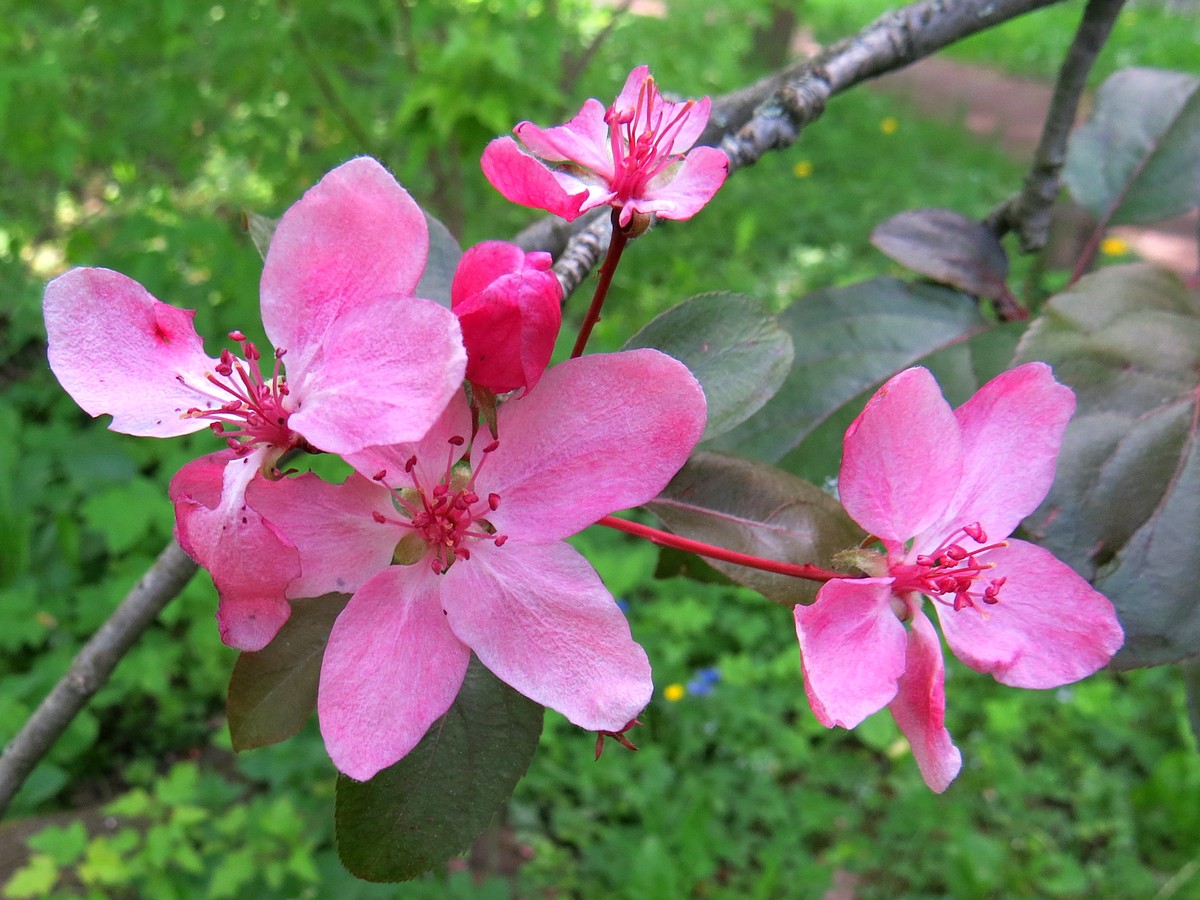 Прилича на черешови цветове, обилен цъфтеж - пъпките са червени, плодовете са негодни за консумация.