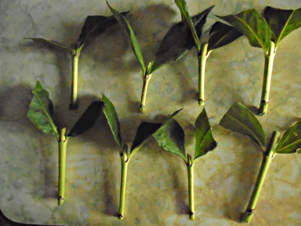След това стъблата се разделят на части. На всеки сегмент трябва да има два възела. Освен това долните листа се отрязват напълно, а горните оставят половината.