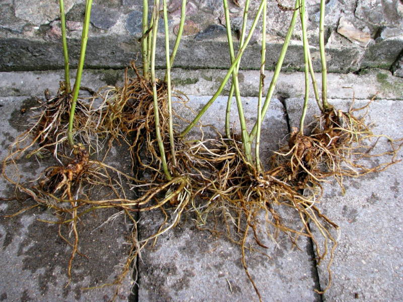 В самото начало на есента трябва да извадите растението от земята. Най-обемните корени са подходящи за разделяне. Те трябва да бъдат разделени на парчета от 6-7 см и засадени с тънкия край надолу. След това резниците се покриват със слой пясък (около 5 см) и леко се навлажняват.Кутията е прибрана в стая без достъп до слънчева светлина. Препоръчителната температура е около 12-15 ° C. За да се стимулира растежа на издънките, температурата се повишава до 20 ° C след 3 седмици.