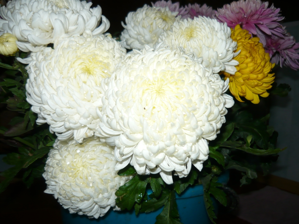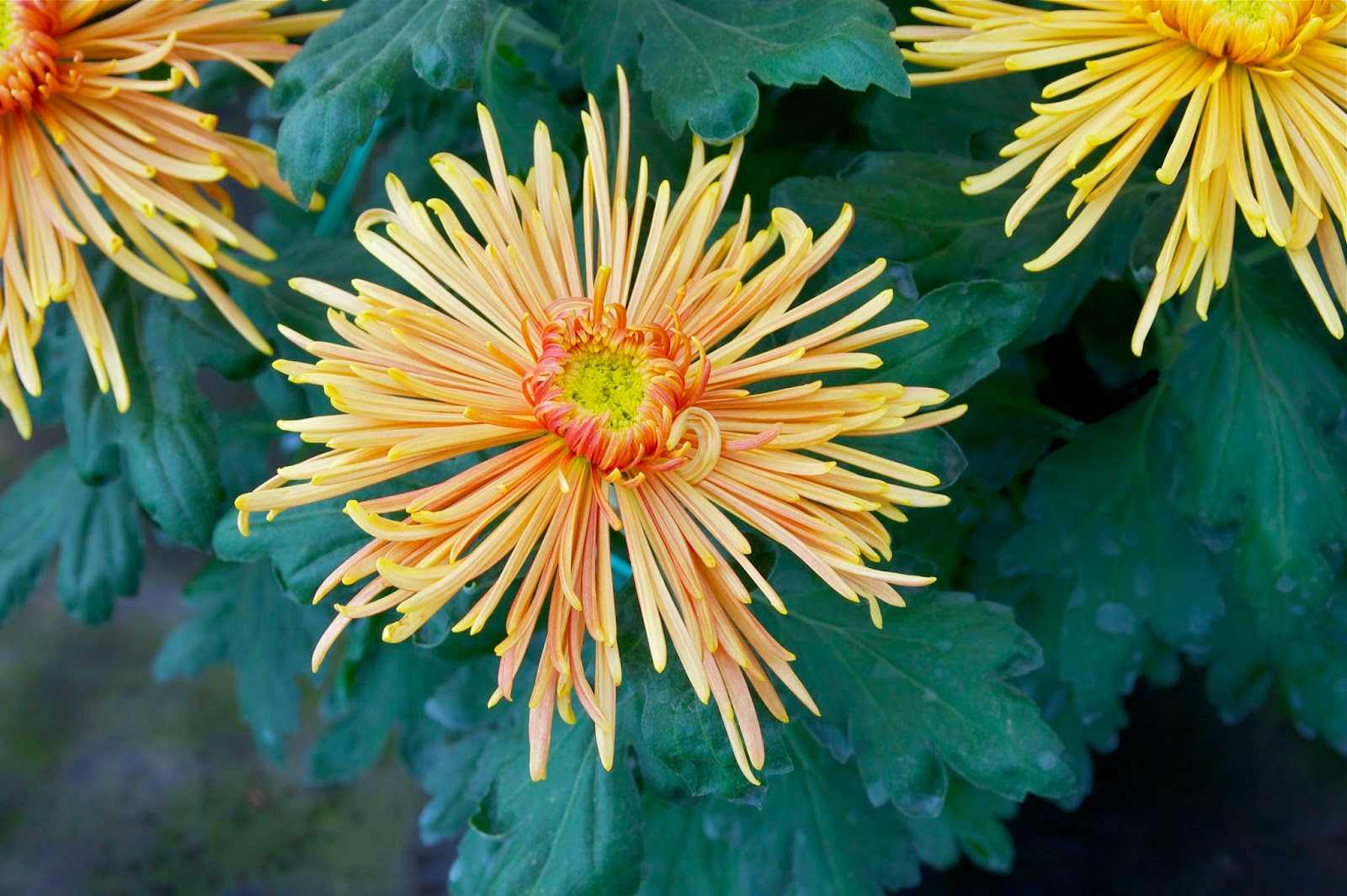 Цветята на хризантемата имат различни цветове: бяло, златисто, жълто, розово, оранжево и др.