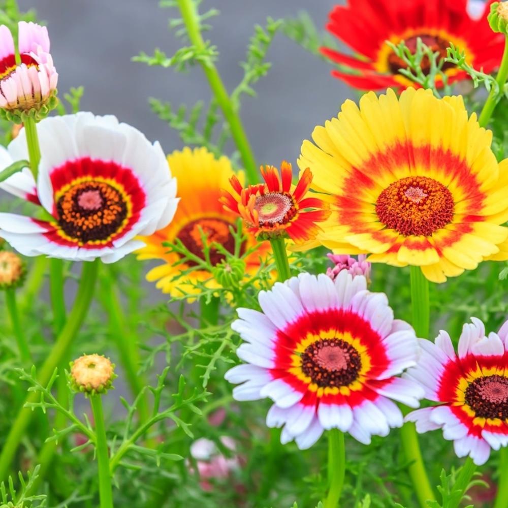 Цветни, или трицветни, хризантеми (ботаническо наименование - Crysanthemum tricolor или Crysanthemum carinatum) произхождат от Мароко. Втулките могат да бъдат до 60 см високи и 30 см широки. Листата са многобройни, месести. Цъфти през лятото или есента. Как изглеждат цветята на такава хризантема? Съцветието е просто, но има много оригинален цвят, образувайки комбинация от многоцветни концентрични кръгове.