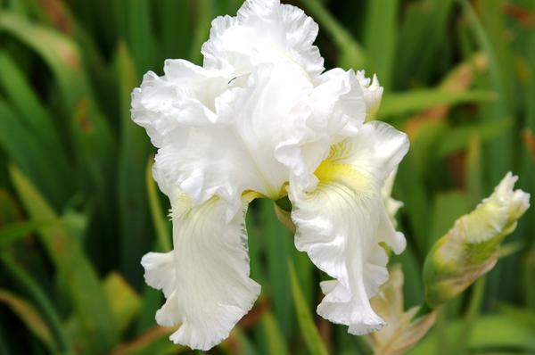 Цвете на бял ирис в цветна леха изглежда изящно. Повечето сортове принадлежат към брадатата група. Някои видове имат малки петна по венчелистчетата в основата на ярък тон. Благодарение на селекцията се появиха растения с уникален външен вид. Изберете от следните сортове: