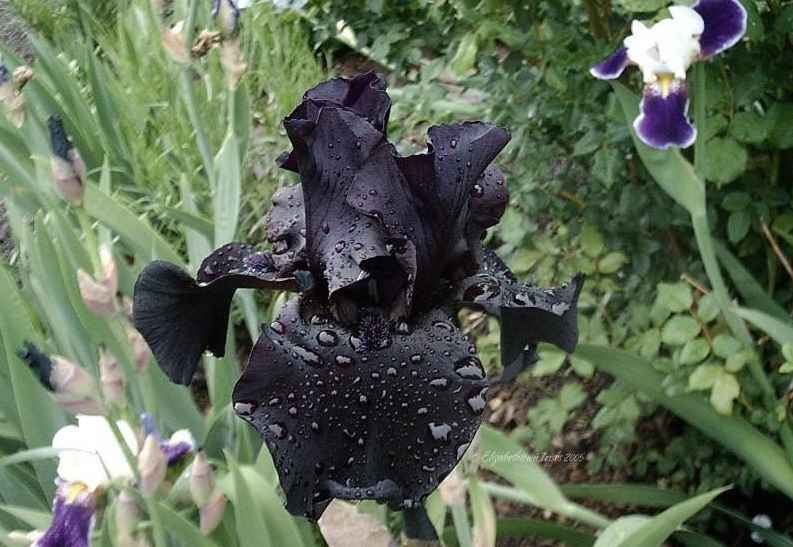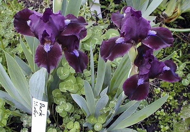 Ирисът с лилаво оцветяване се комбинира с нежни цветя от бели и розови тонове. Най-добрите представители на този вид: