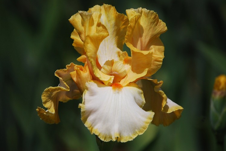 - Валс за шампанско. Височина на цветята 92 см. Бели фалове с кайсиево-жълта гофрирана граница и червени бради.