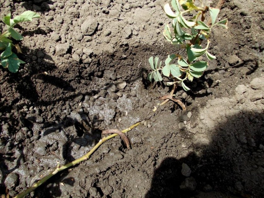 - На ново място се подготвят дупки до дълбочината на първите пъпки по леторастите. Смесете почвата с торове, компост или торф, обработете с манган или фунгициди. Изсипете кофа с вода в дупката.