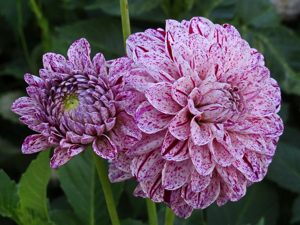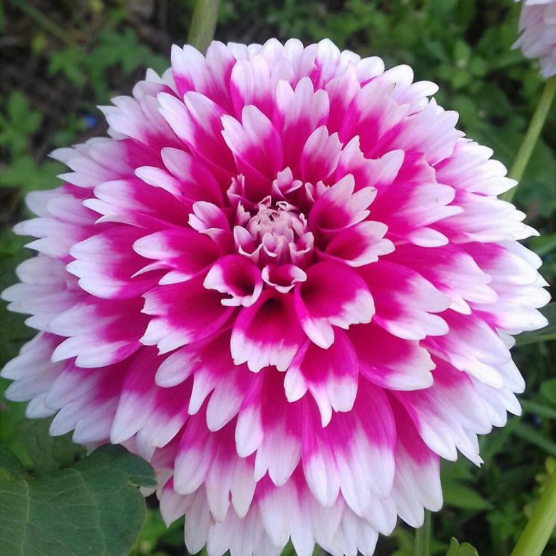 Мраморна топка очарователни цветя. Разноцветните съцветия с доливи на слива на бял фон са подчертани от тъмнозелена зеленина. Сортът е добър както за рязане, така и за ландшафтен дизайн.