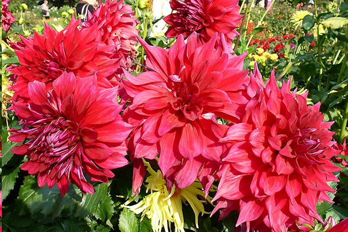 Високите сортове се отнасят към цветни лехи. Това е най-многобройната и ефективна група. Поразителен представител на него е далията Barbarossa с огромни червени цветя с диаметър 25 см и височина на храста 2 метра. Не толкова висока (120 см), но запомняща се - храсталата далия Жълта звезда с ярки ресни съцветия.