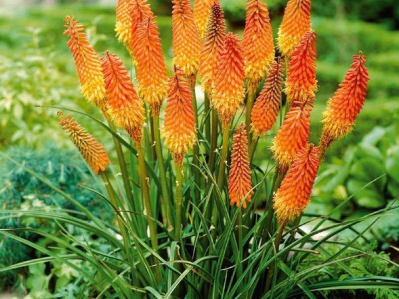 - knifofia Alcazar. Височина 80 см, оранжеви съцветия;