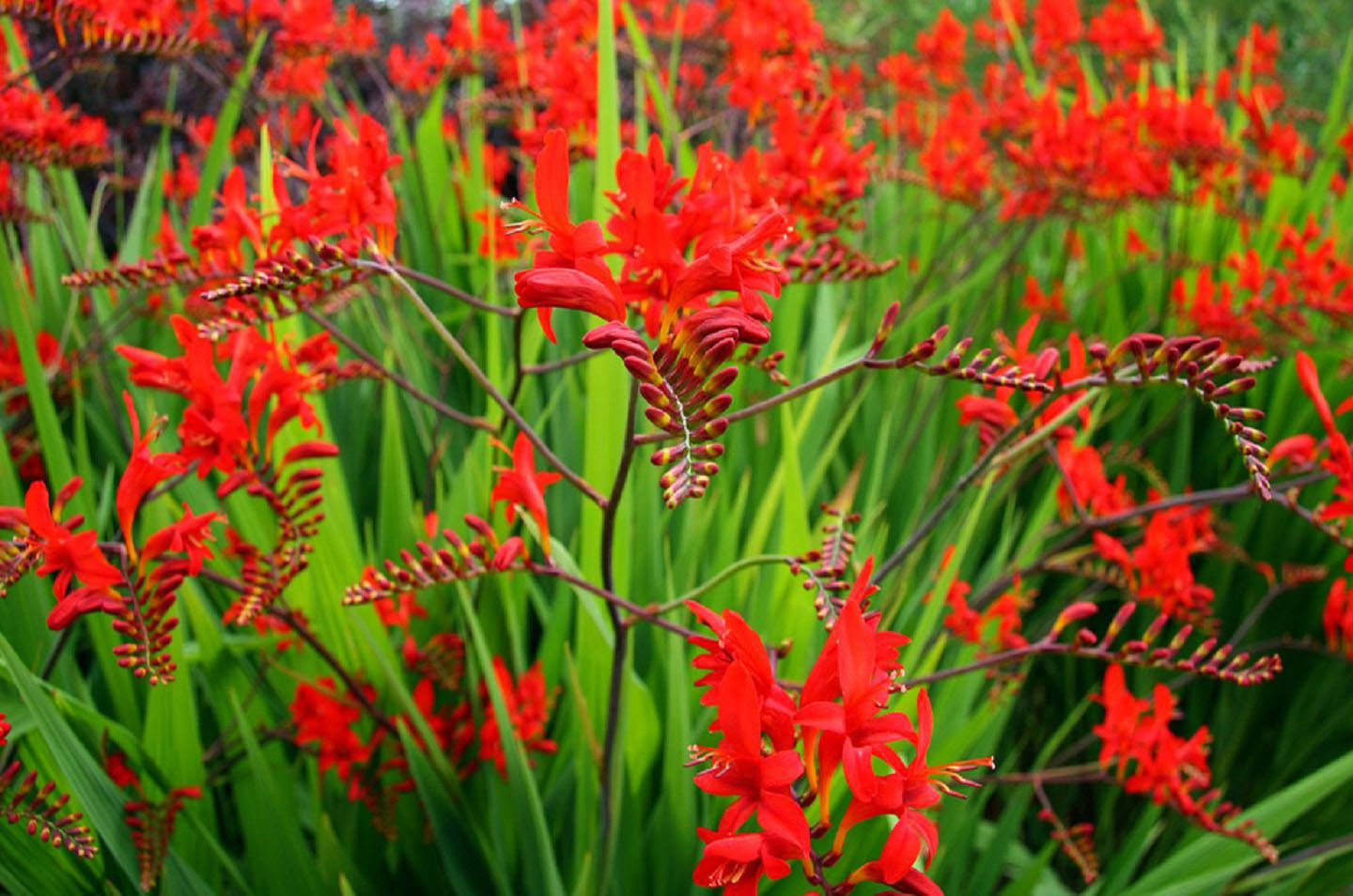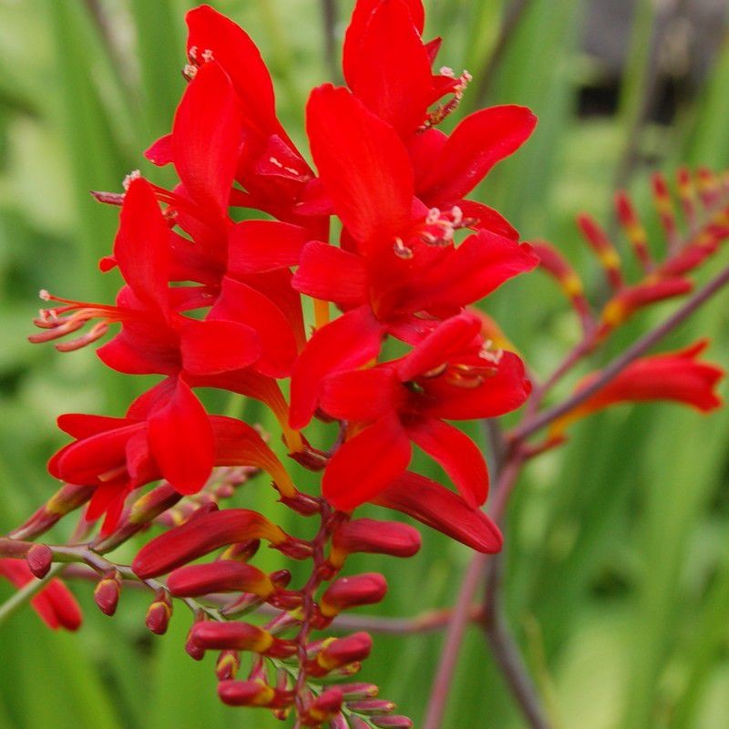 - Крокосмия Луцифер. Растението може да достигне височина 150 см. Дръжките са прави, цветята са наситени червени или пастелни цветове. Сортът се отличава с висока устойчивост на замръзване, поради което крокосмия Луцифер се отглежда най-често в северните райони на Русия. В същото време в региони с не твърде мразовита зима градинарите оставят луковиците на растението за зимуване в почвата.