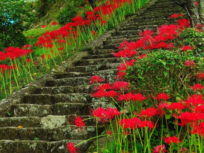 Ядосаният Бог изпратил проклятие върху Сага и Манджу. От този момент нататък зеленината и цветята на растението никога повече не могат да се срещнат. Веднага щом ликорисните цветя започнат да цъфтят, зелената маса отпада. По време на образуването на нови листа цветята изсъхват. Смята се, че след срещата в ада влюбените се заклеха един на друг да се срещнат по време на прераждането и никога повече да не се разделят. Уви, това не се случи. Всички в Япония знаят тази легенда.