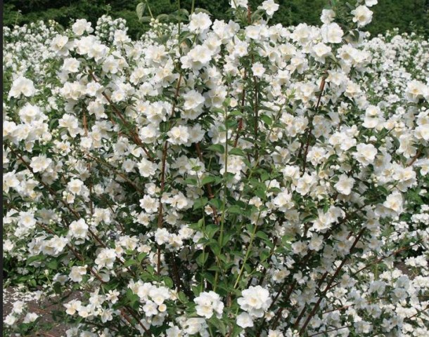 Отличава се със своите двойни снежнобяли цветя под формата на звезди с удължени вътрешни венчелистчета. Размерът на пъпката може да достигне 5,5 см. Компактният храст с височина до 1,5 метра има дълъг цъфтеж с приятен аромат на ягоди. Храстът се нуждае от резитба. Листата на растението са овални, светлозелени, цветето се състои от няколко реда вълнообразни удължени венчелистчета, вътрешните са удължени. Не обича солените почви и обилното поливане, устойчиви на суша и замръзване.
