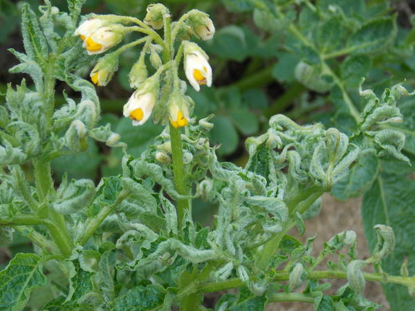 Усуканите листа са основният признак на увреждане на цвете от вредители.