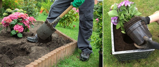 Схемата на засаждане на хортензии в ямата за засаждане: