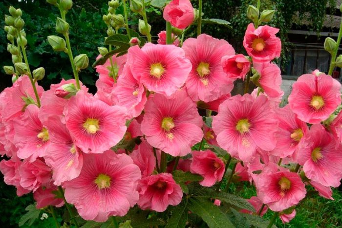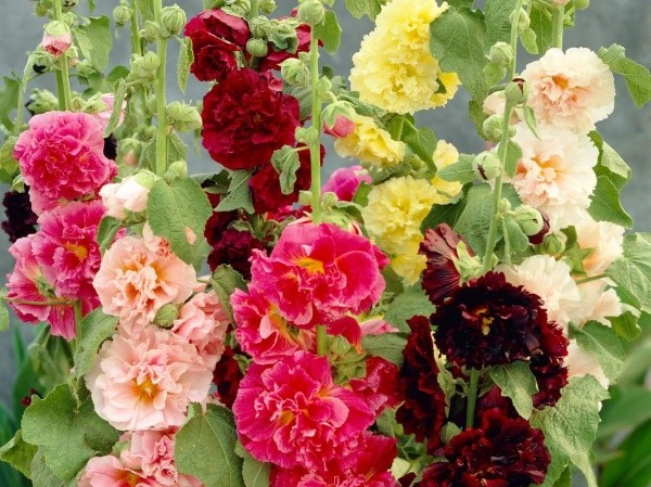 - Хибрид от малва - расте до 2 м и радва с огромно разнообразие от цветове. Най-често съцветията са розови, бели и червени.