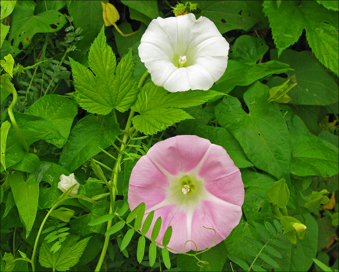 - Стъблата на бръшлян калистегия могат да сплитат беседки, стени и арки. Поради това строителните конструкции изглеждат по-привлекателни и се крият от любопитни очи.