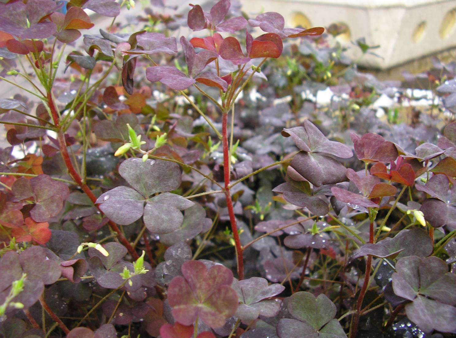 Този червен оксалис се счита за топлолюбиво растение, което е идеално за отглеждане в домашни условия. Височината на храста достига 15-17 сантиметра. Триъгълният оксалис има голяма зеленина, с нехомогенен цвят. Краищата на листните плочи са оцветени в тъмно лилаво.В централната част цветът е по-светъл.