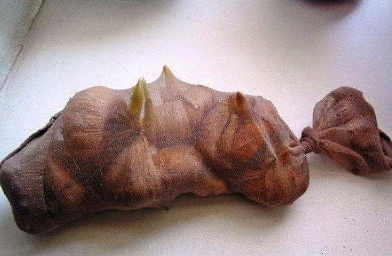 Ако в дома ви има хладна, тъмна стая, удобно е да съхранявате крушките в синтетични чорапи. Така ще им бъде осигурен достъп на открито. Чорапи, пълни с грудки, са завързани и фиксирани към стената.