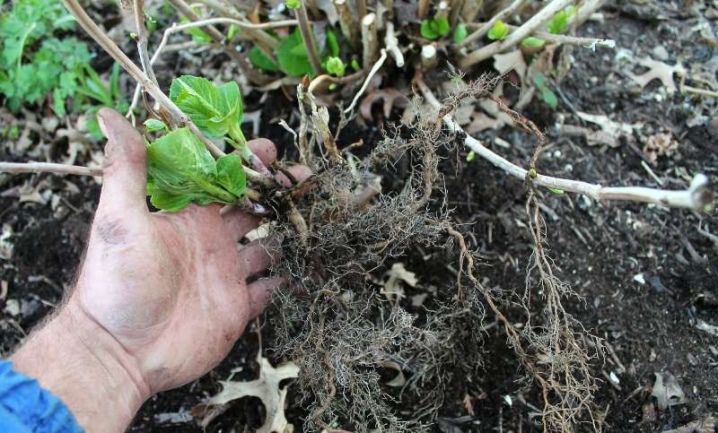 - Ако растението достигне петгодишна възраст, тогава размножаването на корените се използва за размножаване. В началото на пролетта храстът се изкопава, нарязва се на няколко парчета и се засажда. Важно е пъпките да присъстват на всеки от тези корени.