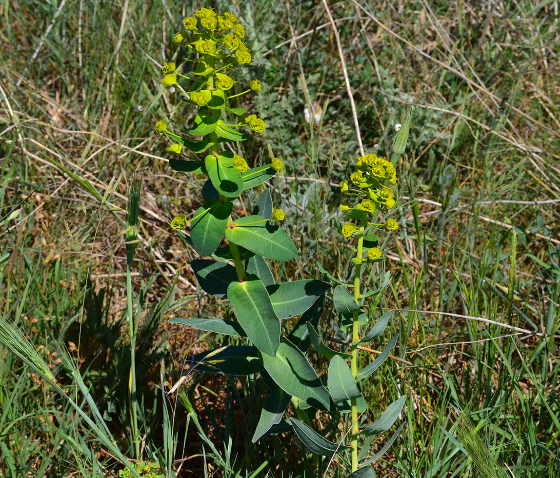 В допълнение към вътрешните и външните декоративни видове, в природата съществува дива еуфорбия (градина) или плевел. Появявайки се в градината, плевелите са вредни от факта, че не позволяват на други култури да се развият напълно. Еуфорбията е трудна за премахване от мястото - тя има дълъг корен с форма на чешма, който дава нови растения, ако не е напълно отстранен.
