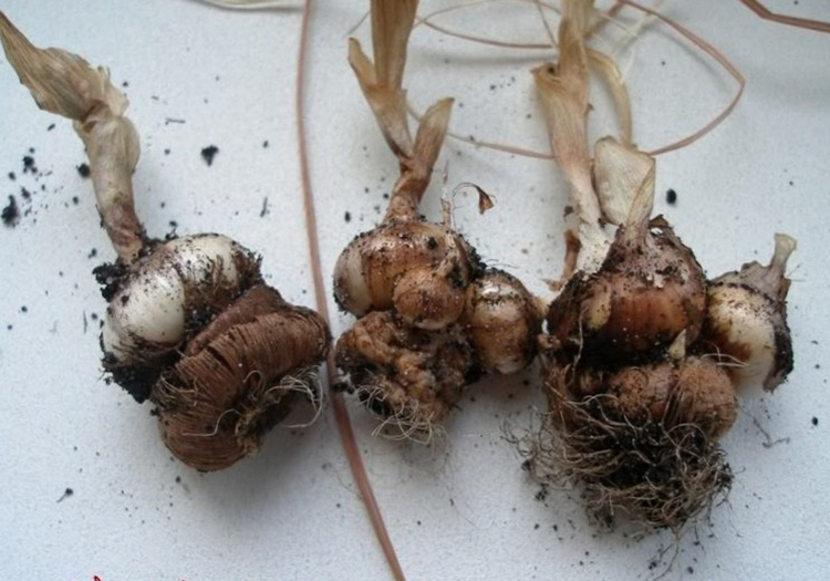 - Дъщерни крушки. За да направите това, трябва да изкопаете растение за възрастни и да намерите други в района на основната крушка, те са с малки размери. Те трябва да бъдат внимателно разделени и разположени на отделни места.