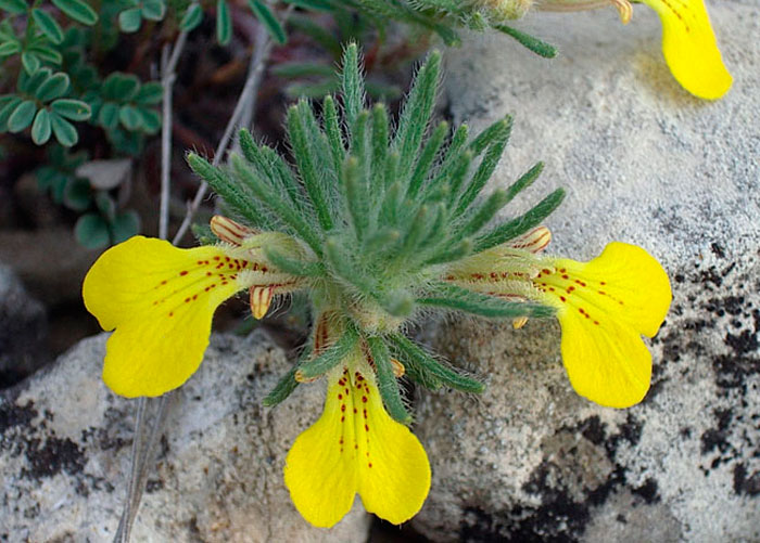 Расте само до 6 см. Листата имат зелено-сив оттенък и назъбени краища. Приличат на подутини. Цветята са жълти.