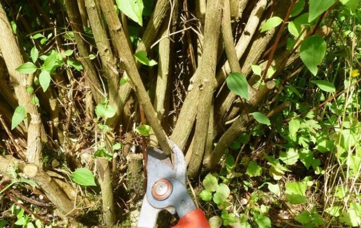 - Старите издънки, сгъстяващи храста, се изрязват до нивото на земята.