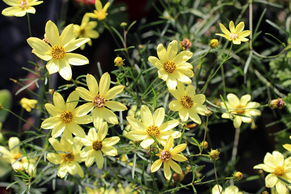 Цветята на Coreopsis verticillata приличат на много звезди от жълти, розово-лилави, бордо-червени нюанси на фона на буйна зеленина.