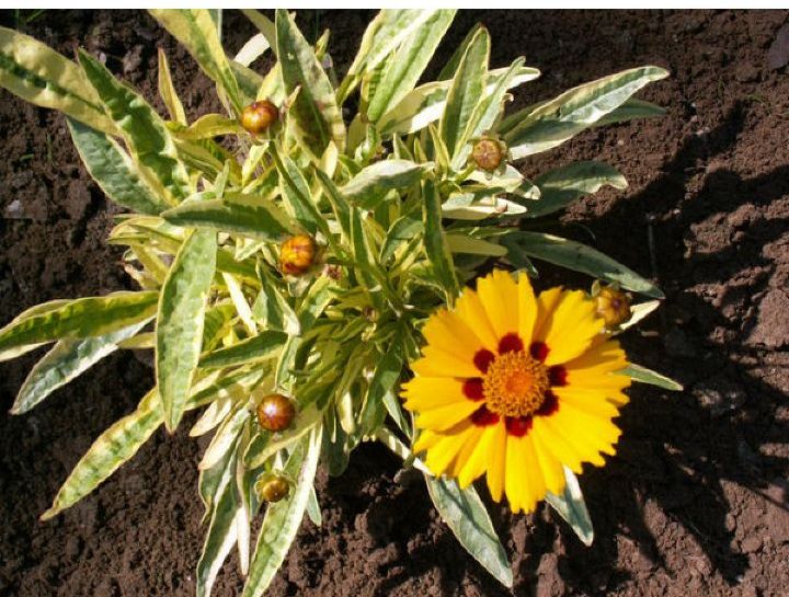 В пъстър кореопсис са красиви не само цветята, но и листата. Това е пъстър сорт, получен от grandiflorum с големи цветя и гъста зеленина.