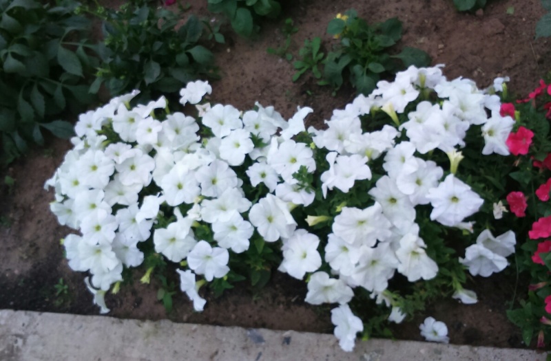 Синята петуния е най-добре да се засажда в комбинация с храсти, които цъфтят с бели пъпки.