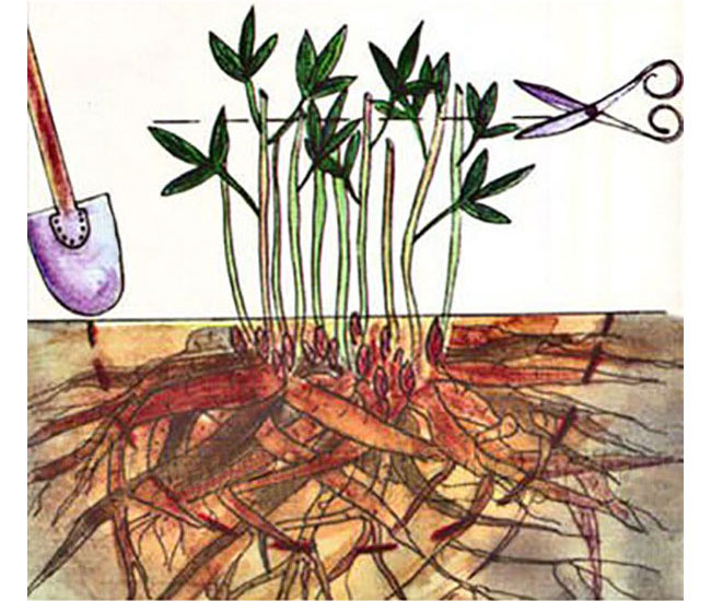 - Разгледайте коренищата. Ако има гниене, изрежете с дезинфекциран нож. Материалът се съхранява в манган (2 g на 5 l вода).