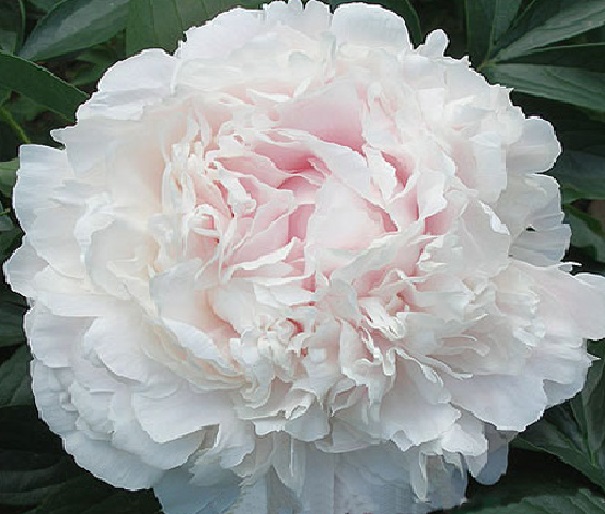 Двойно цвете, с диаметър 17 см. Чисто бели листенца с кремообразен и светлокафяв оттенък. Венчелистчетата са кръгли и с чашка.
