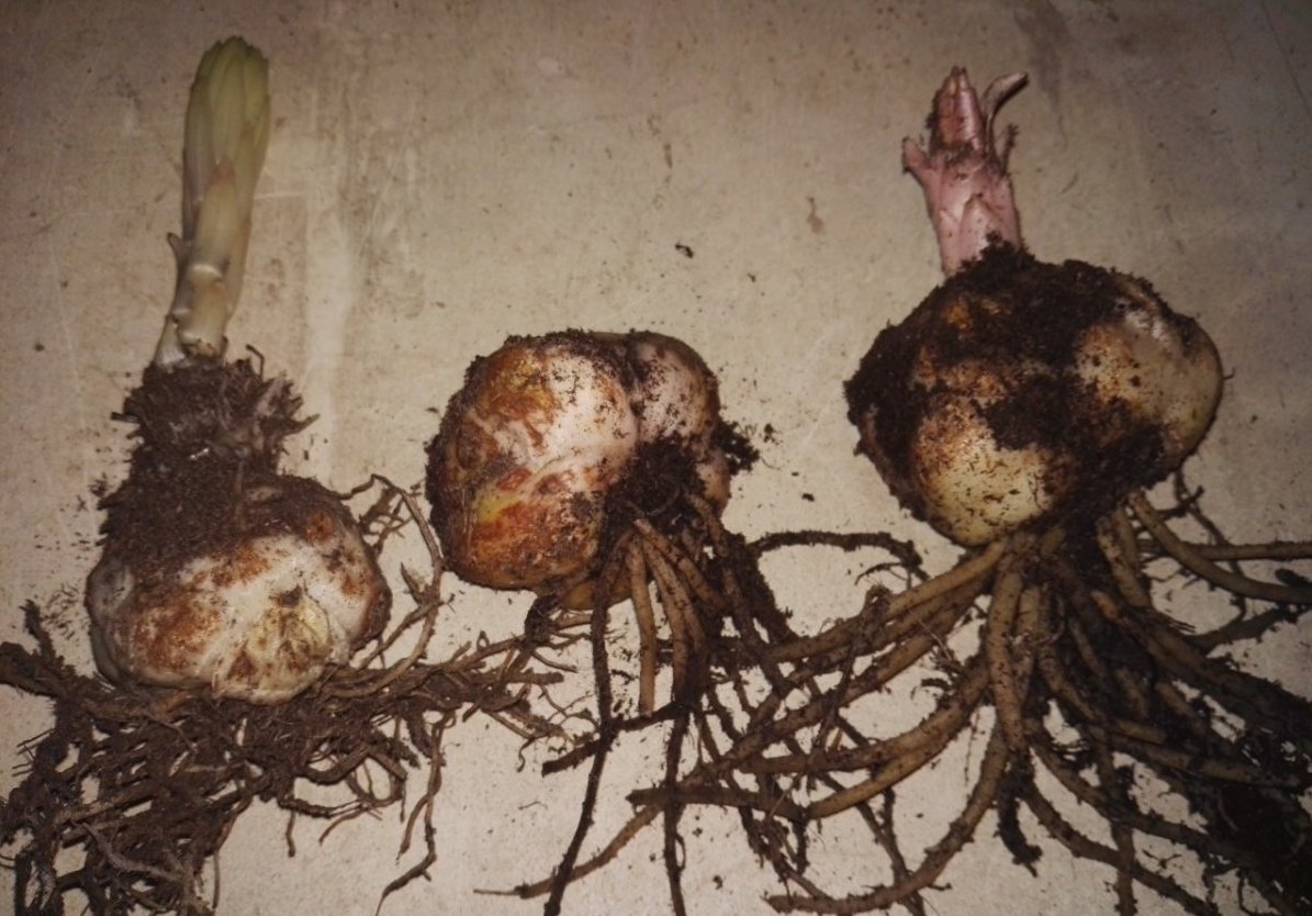 - Коренищата се отстраняват от почвата и се отърсват. Те се изследват и се премахват изгнили или изсъхнали придатъци.