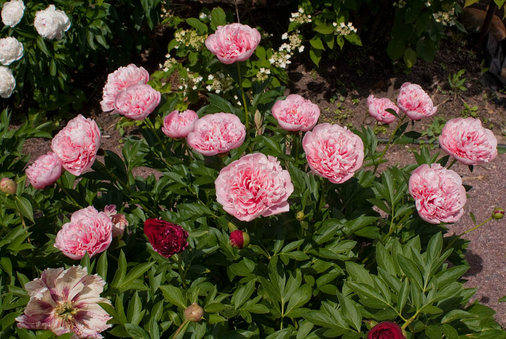 Оригинално изглеждат прости градински пътеки с божур вместо граница. Чарът не се губи дори когато божурът е избледнял, защото зеленината на растението изглежда доста декоративна. Не изсъхва след цъфтежа, остава сочен и зелен до късна есен.