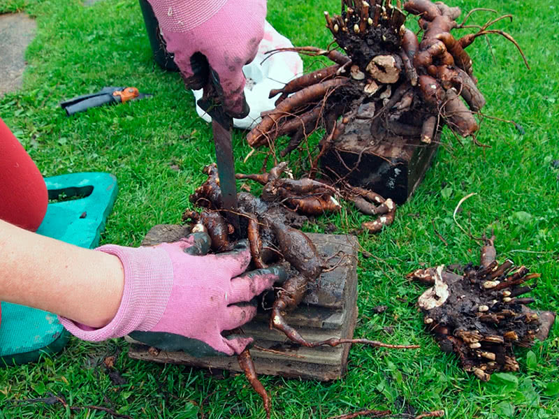 - Изкопайте божура, почистете коренището от земята и го разделете на няколко части.