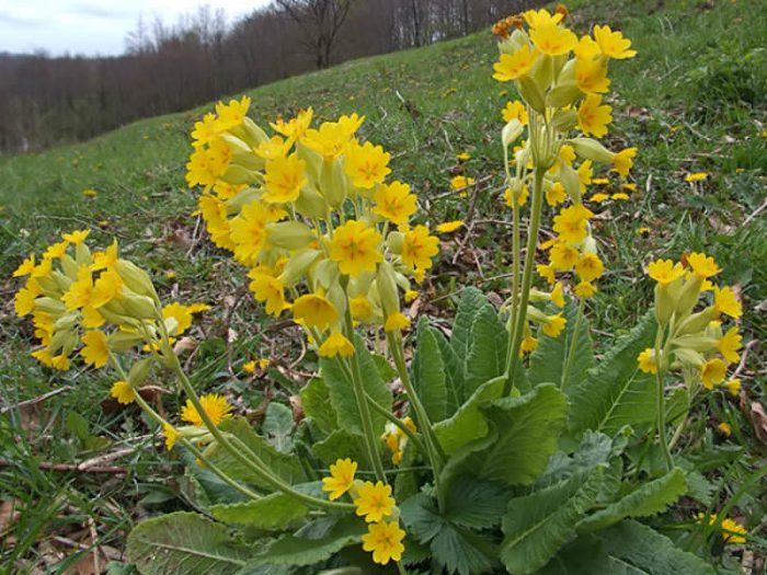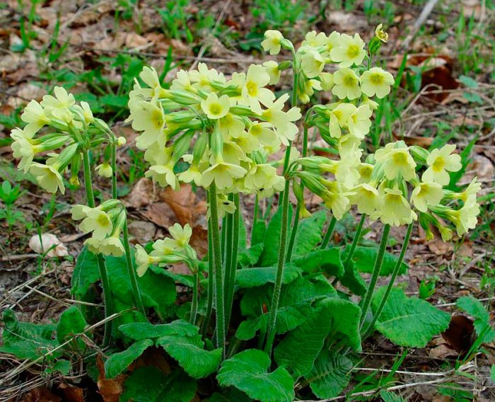 Произход от Карпатите и южните и северните части на Западна Европа. Листата са с овална форма с фино назъбен ръб. Дължината на листните пластинки е 5-20 см, ширината е 2-7 см. Листата силно се стесняват към дръжката. От предната страна вените на листата са вдлъбнати, а от шевообразната страна са изпъкнали. Съцветията са във формата на чадър. Състоят се от 5-15 цветя. Диаметърът на цветята е 2 см. Цветът им е бледожълт. Височина на дръжката 10-35 см. Цъфти през април в продължение на 60 дни.
