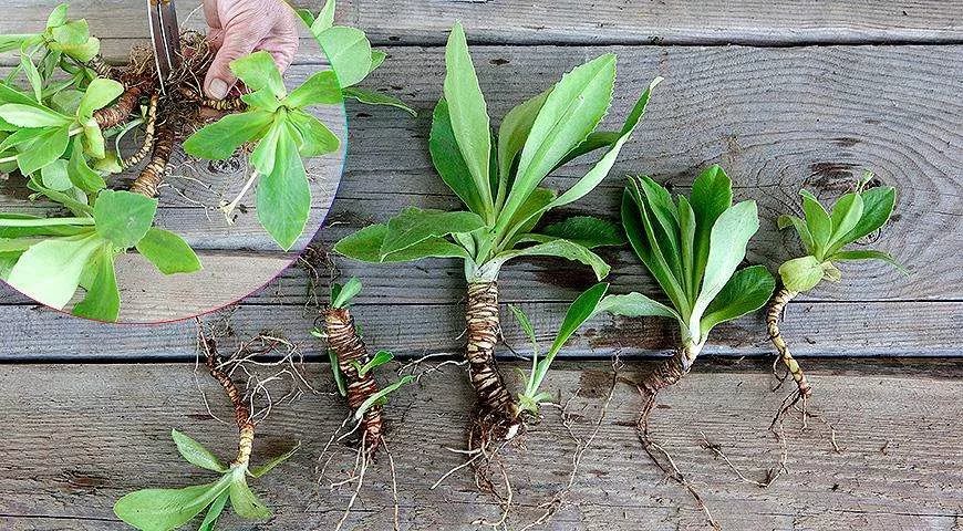 Растението, което ще се разделя, се полива обилно. След това, два часа по-късно, се изкопава. След това те се разглобяват в гнезда. При младите видове разделянето е по-лесно. Старите растения трябва да използват нож. От всяка част се оставя парче коренище.
