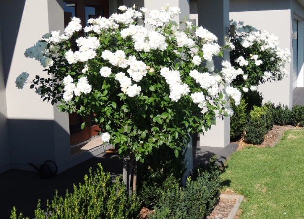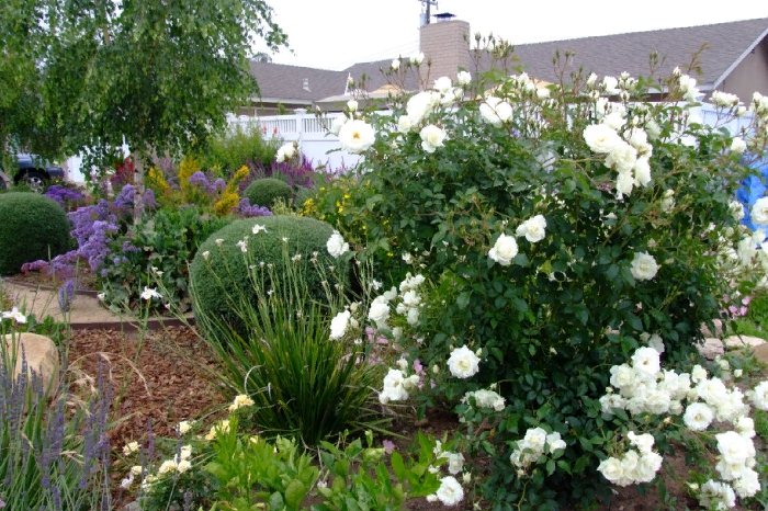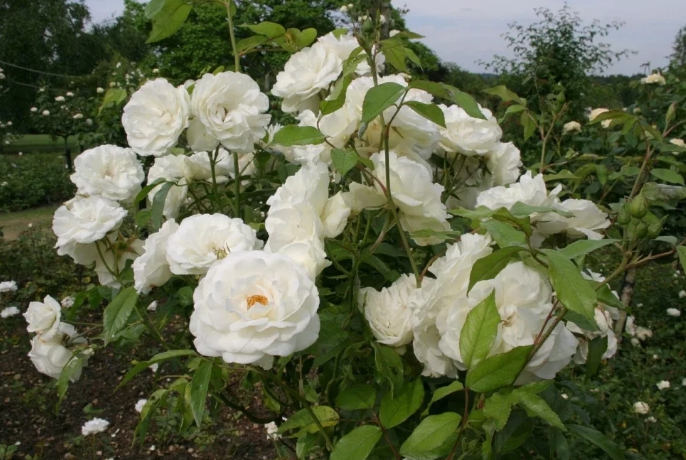 Напоследък белите монохромни градини стават все по-популярни. Като основа за такива насаждения можете да използвате катерещата се роза Айсберг.