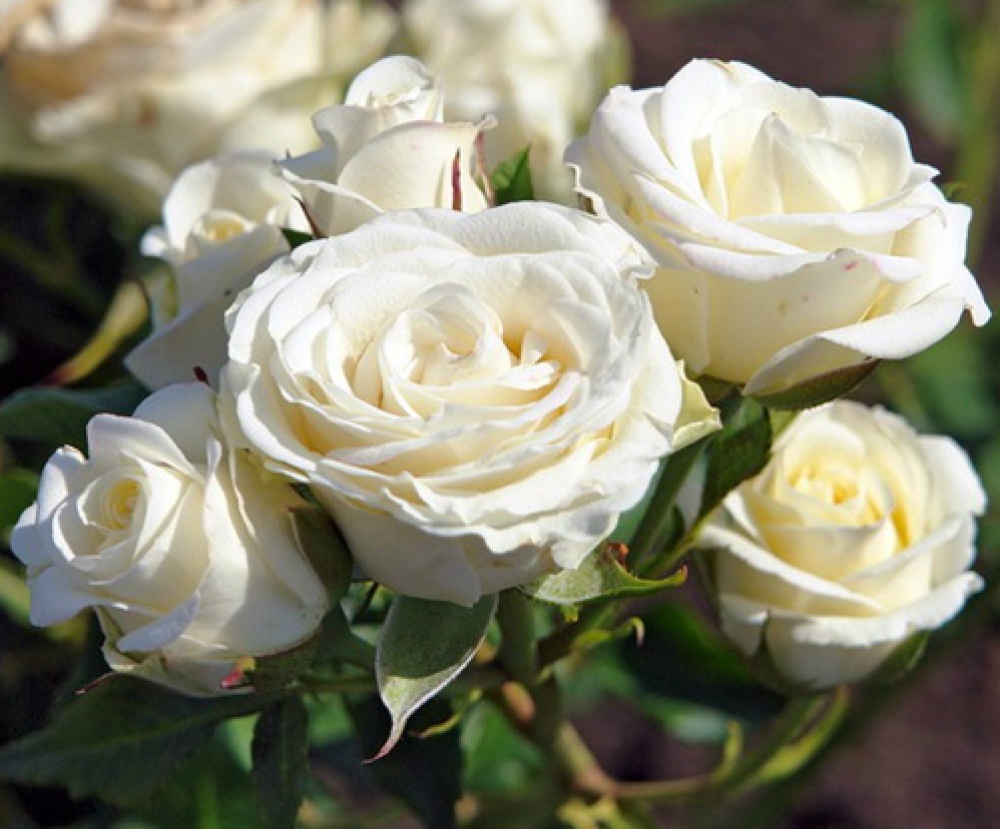 Розовите храсти са гъсто покрити с листа с тъмнозелен тон. Цъфтежът продължава до настъпването на първото студено време.