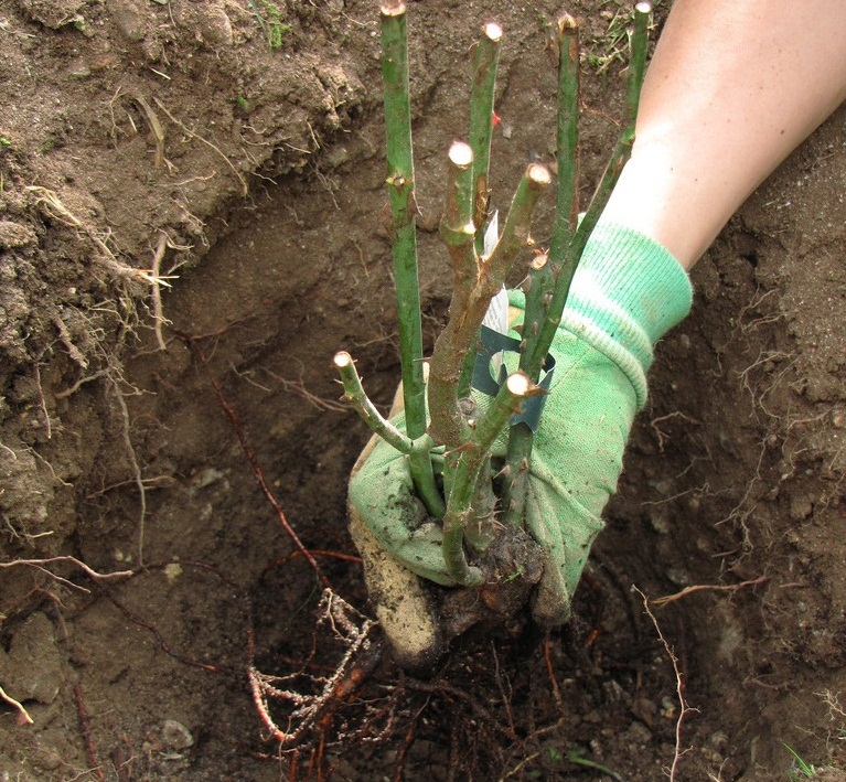 - В дупката се поставя храст, така че мястото на присаждане да е над повърхността на почвата, а кореновата шийка се задълбочава с 4 см. Корените се изправят.