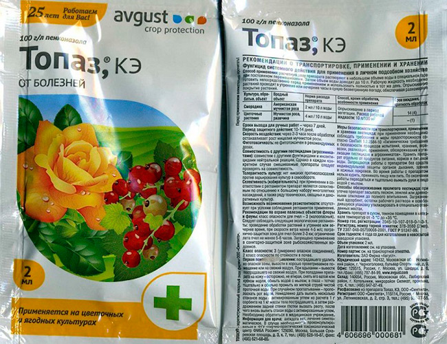 - Топаз. Концентратът на емулсията се разрежда с 2 g в 10 литра вода, използвани срещу брашнеста мана. Необходими са 3 лечения на сезон.