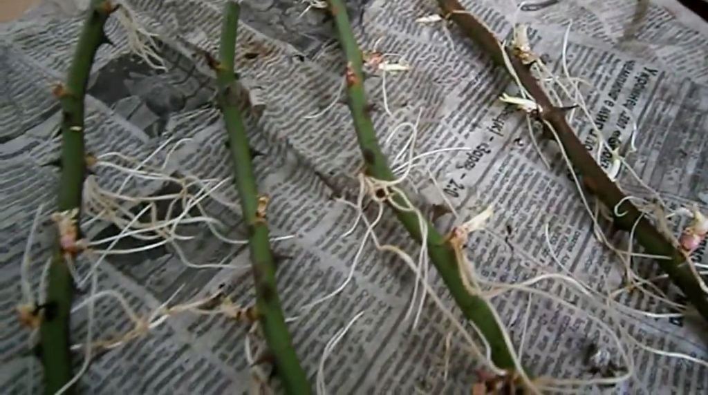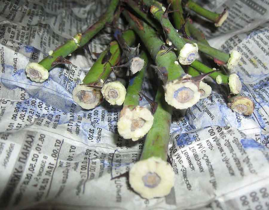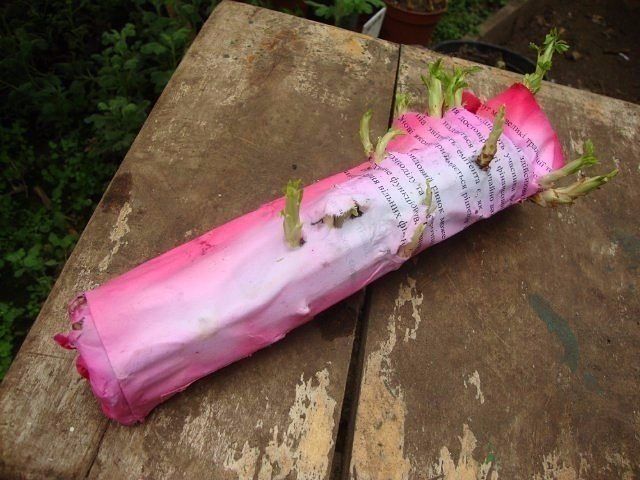 Същността на вкореняването на розите по метода на буррито е абсолютно една и съща - отрязаните резници се увиват във вестник или хартия. В този случай хартиената "торта" трябва да е мокра. В резултат се създават най-подходящите условия, за да се появи калусът първо на клона, а след това и корените.
