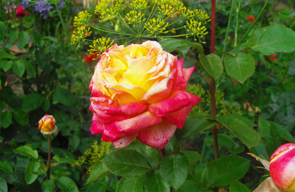 Rose Delight ще озарява всяка градинска площ. Разноцветните двуцветни съцветия изглеждат перфектно при едно засаждане. Ландшафтните дизайнери често засаждат храсти Double Delight на фона на цветна градина. Отпред можете да кацнете: