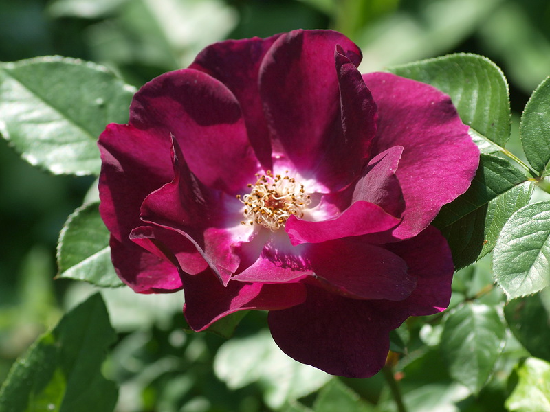 Малките чашковидни цветя на розата са в рамка и лилав цвят. Цъфти през първия месец на лятото.