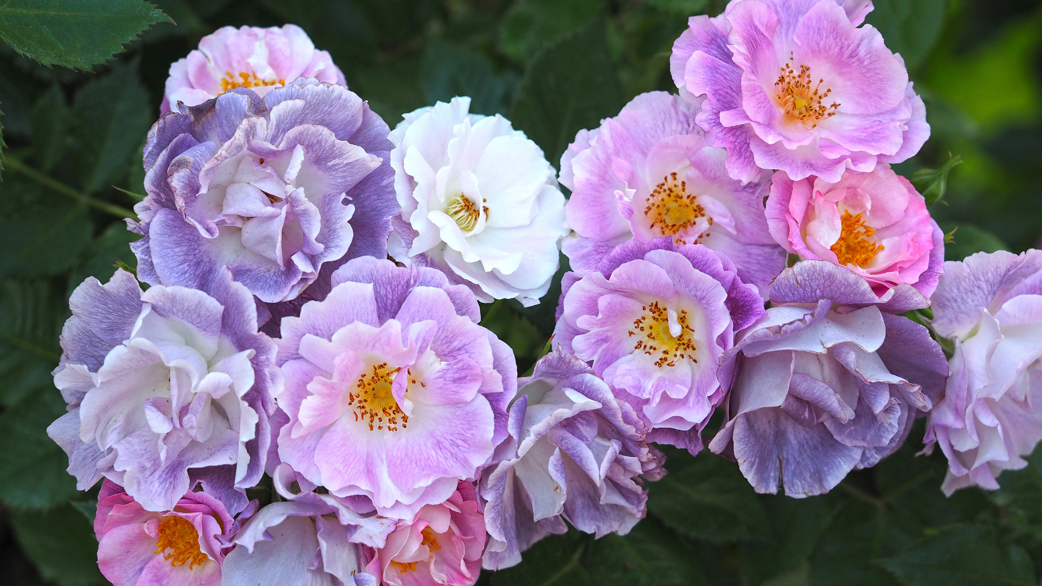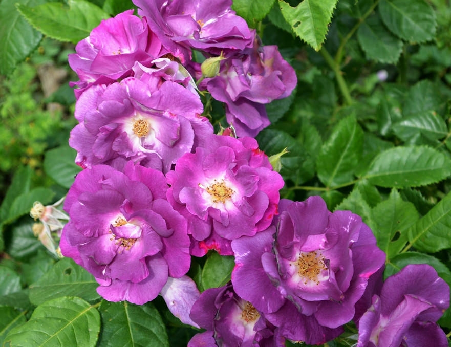 Тези розово-лилави розови цветя са най-близо до синьото.Венчелистчетата на цветята са полу-двойни със златни тичинки в белия център.